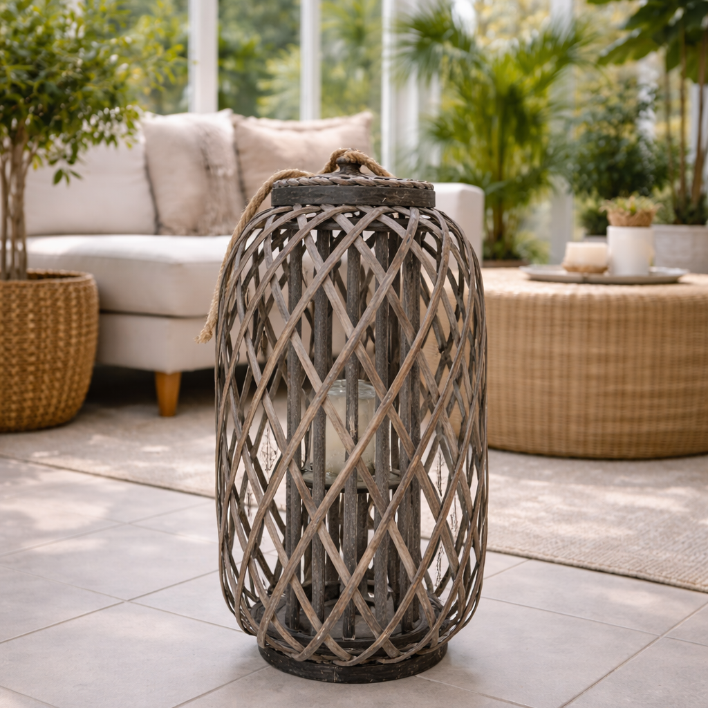 Bring home the Grey Washed Wicker Lantern Large today and let your space shine with elegance and warmth!